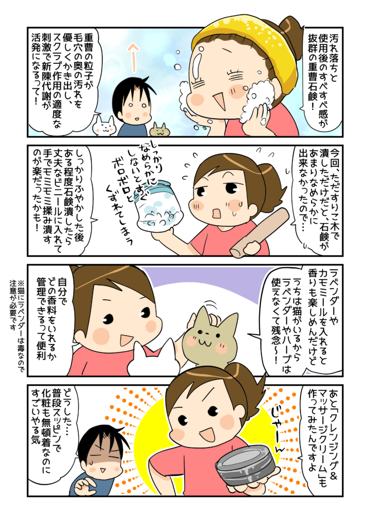 最近では定番となっている重曹とお酢を使ったナチュラルなお掃除方法ですが、今回はちょっと目先を変えて「美容」のコーナー試してみました!重曹で顔を洗う&しかもそれを自分で作るとか、これまで想定したこともなかったこと。とても新鮮でした!しかもどれも簡単!(そして材料費が安い!!)丁度夏休み時期、家族と作ってみるのも楽しいと思います。私の周囲には敏感肌の友人も多いのですが、香料の心配などしないで済む「自分のためだけのもの」を自分で作ってみるという選択肢を試してみるもいいですよね~!