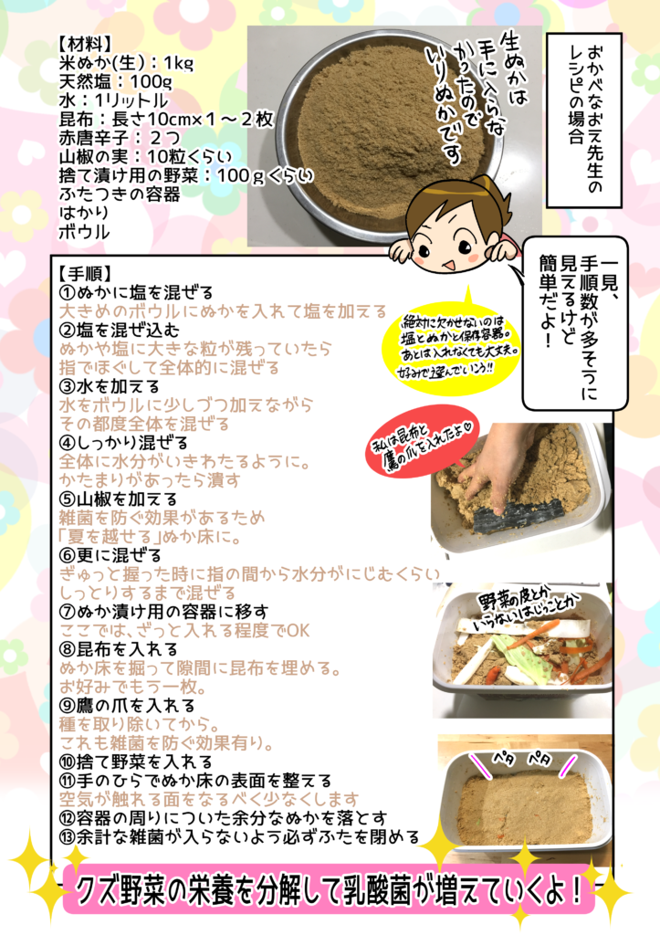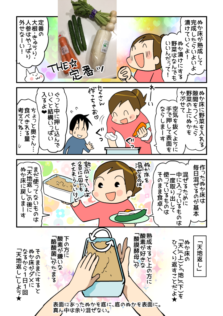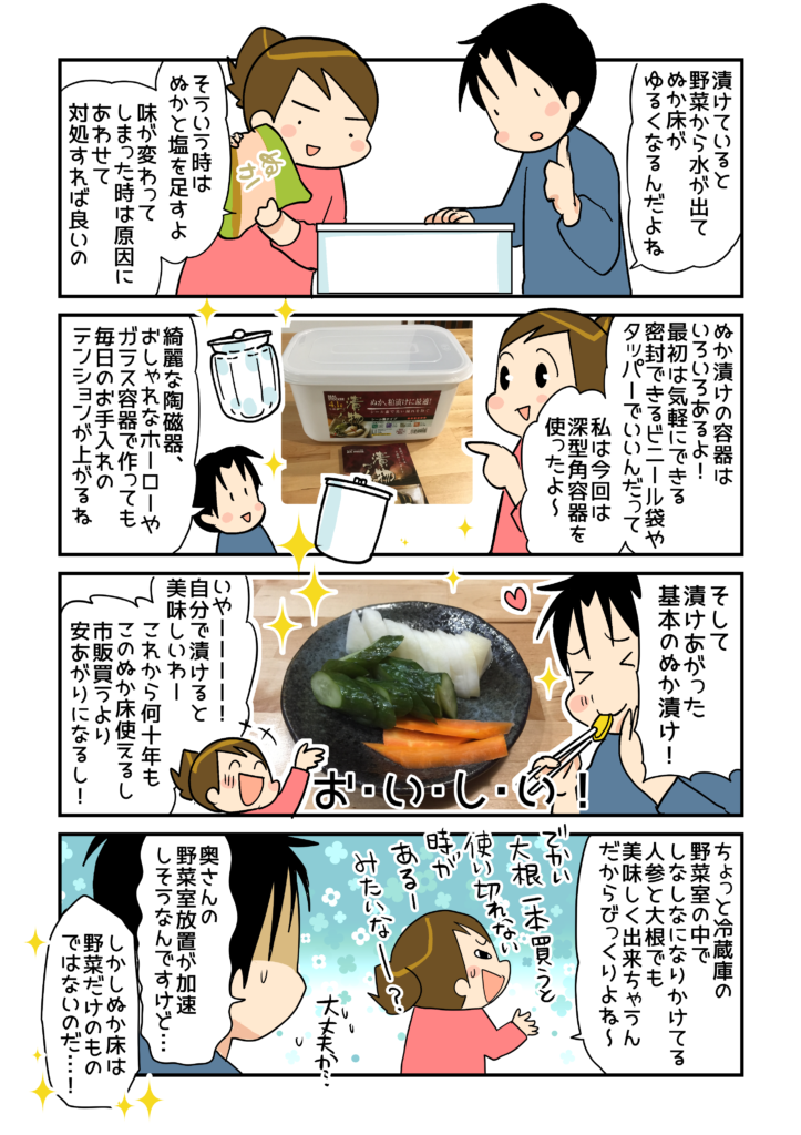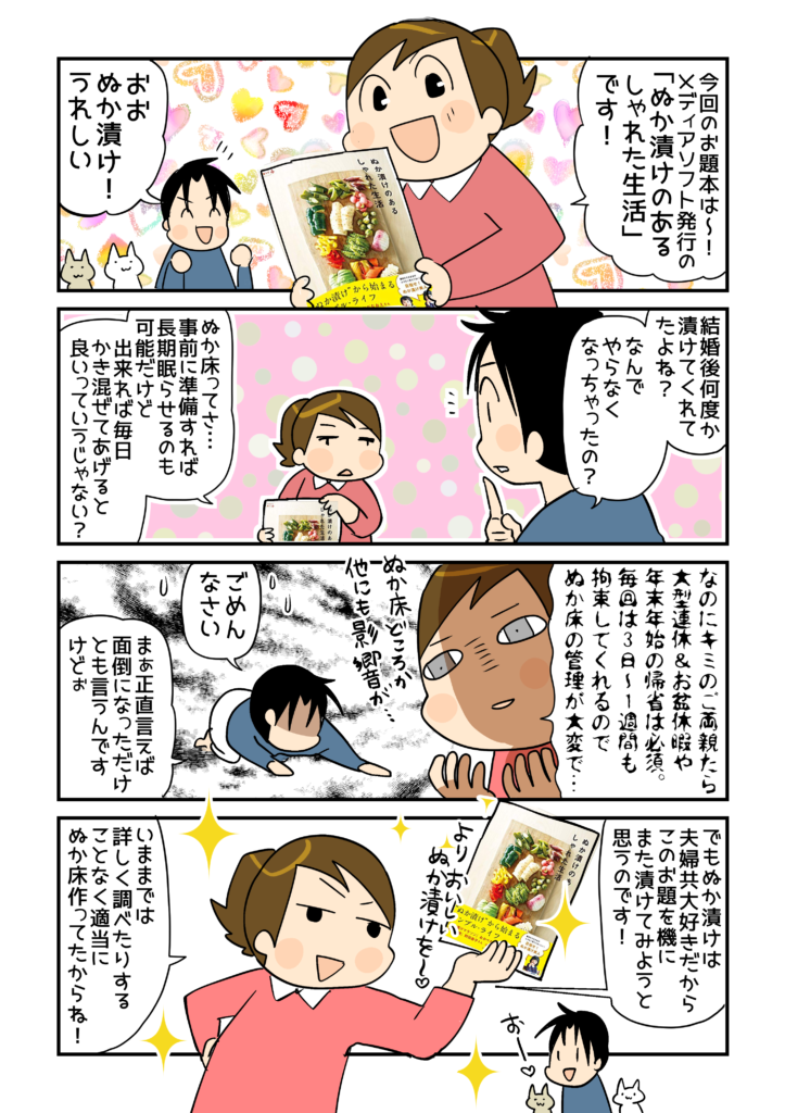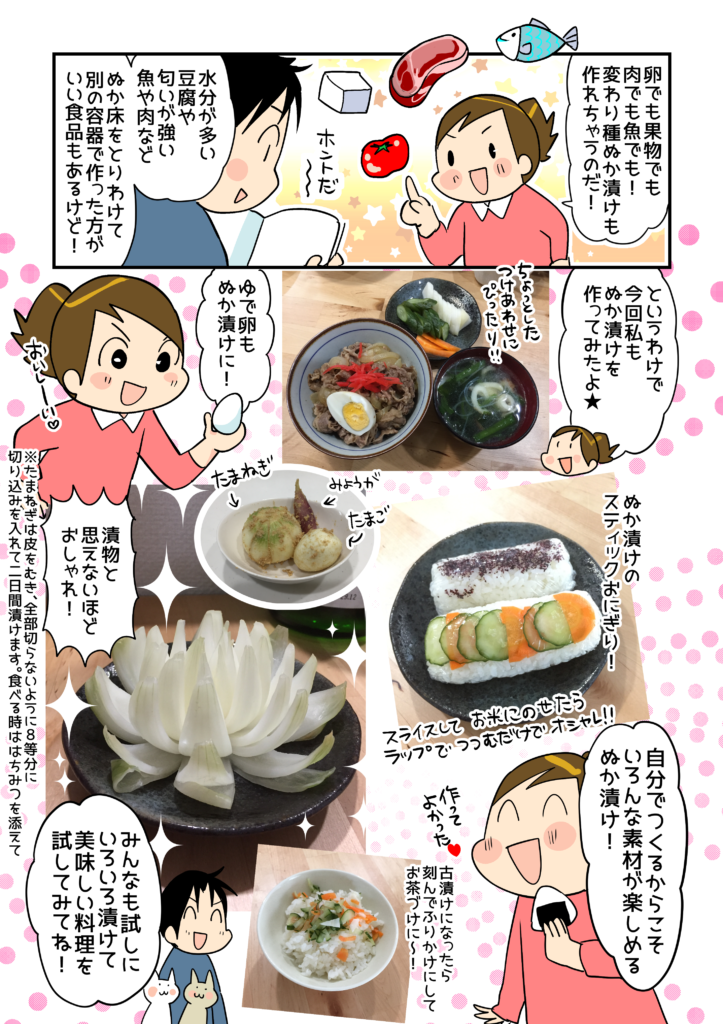 以前にも市販の「簡易ぬか漬け」をしていたことはあったけど、しっかり本などで知識を得て付作っていたわけではなかったので、毎日の管理がしっかりできないことを理由にやめてしまいました。 でも、今回出来上がったぬか漬けを食べたら、もともとぬか漬けが大好きだったことを思い出しました! 一度ぬか床をしっかり作ってしまえば、冷蔵庫の中で1週間くらい放置できる、などの長期保存の方法も記載されているので、これからは安心してぬか漬け生活を楽しむことができます。レシピも載っているので、色々アレンジしてみたいです! ちなみに、作中の玉ねぎのぬか漬けは、本のレシピだと「2日漬ける」とありましたが、わが 家の場合は3日くらいしっかり漬けたものが好みでした。ゆで卵のぬか漬けは1日漬けこむと少ししょっぱくなってしまいましたが、みじん切りにしてタルタルソースにすると 美味しかったです( ́∀` ) 。お好みでアレンジすると良いですね!