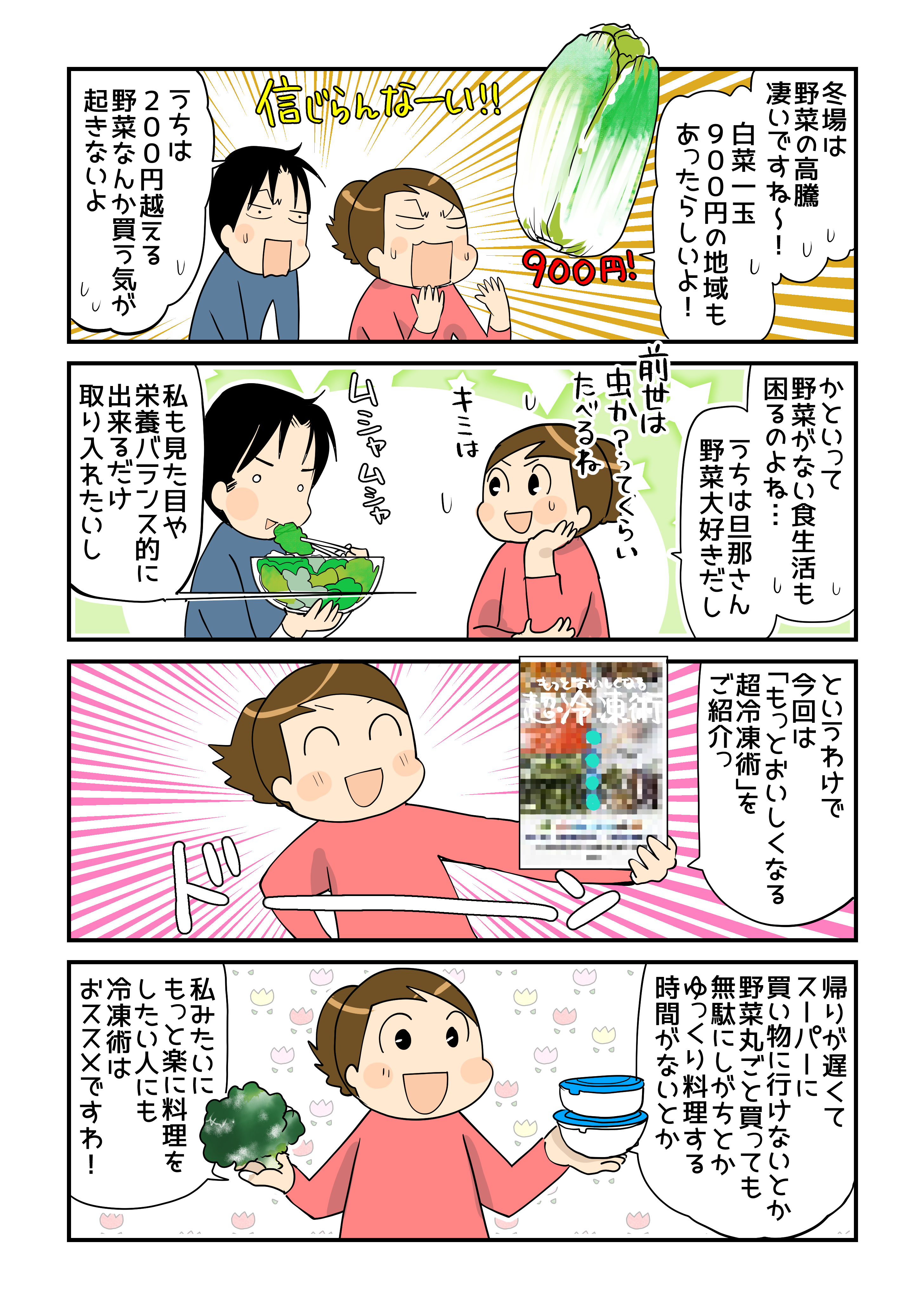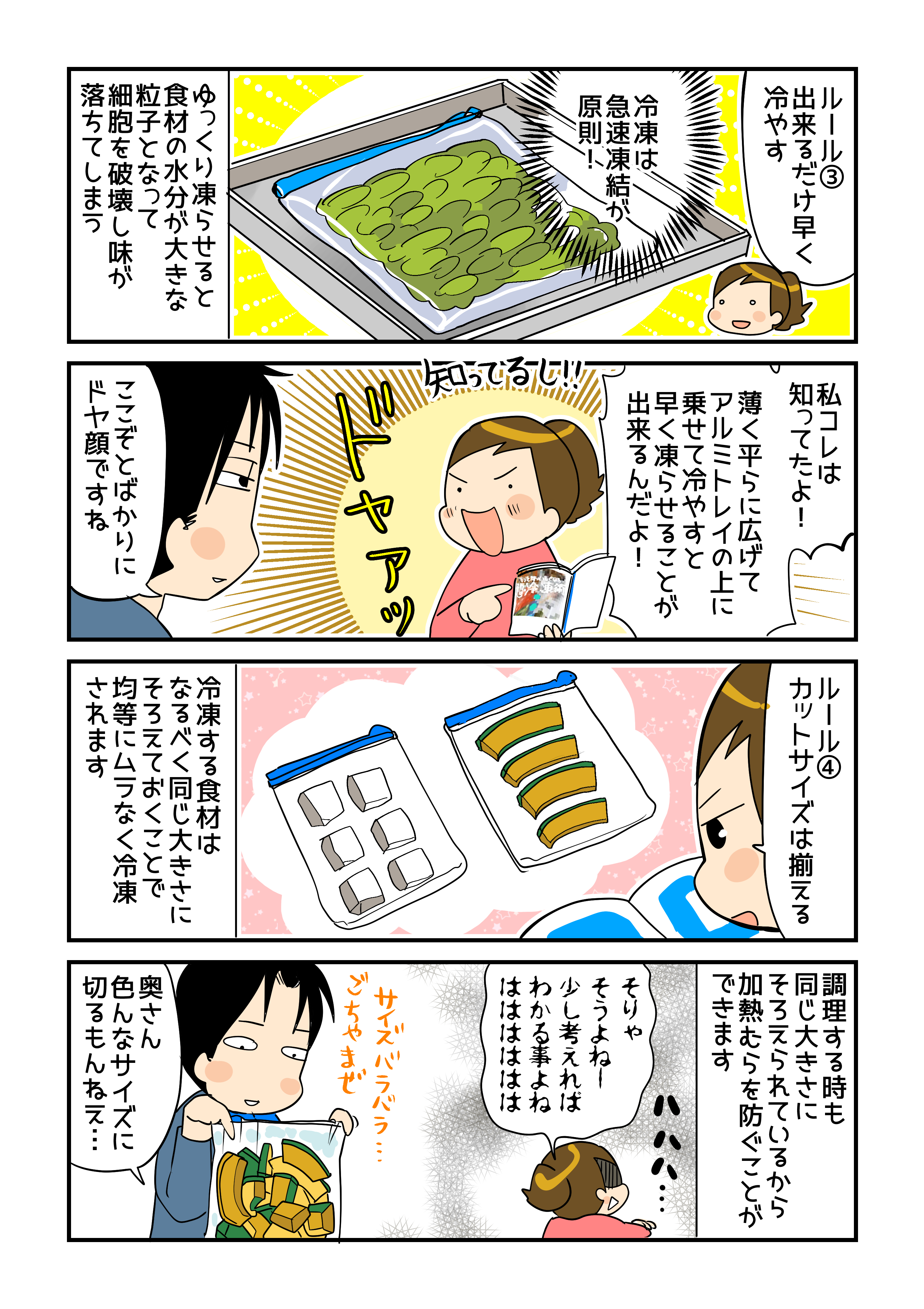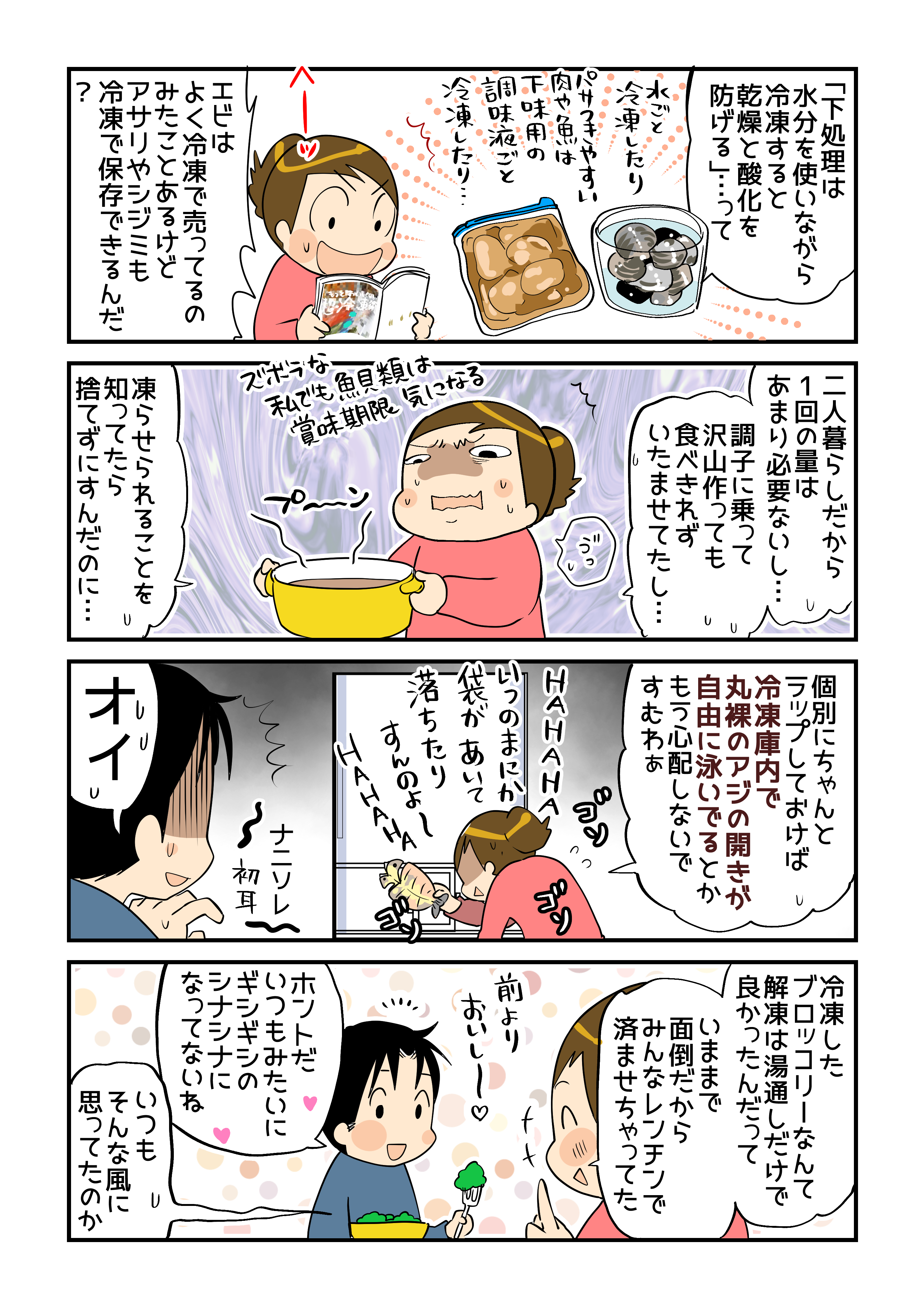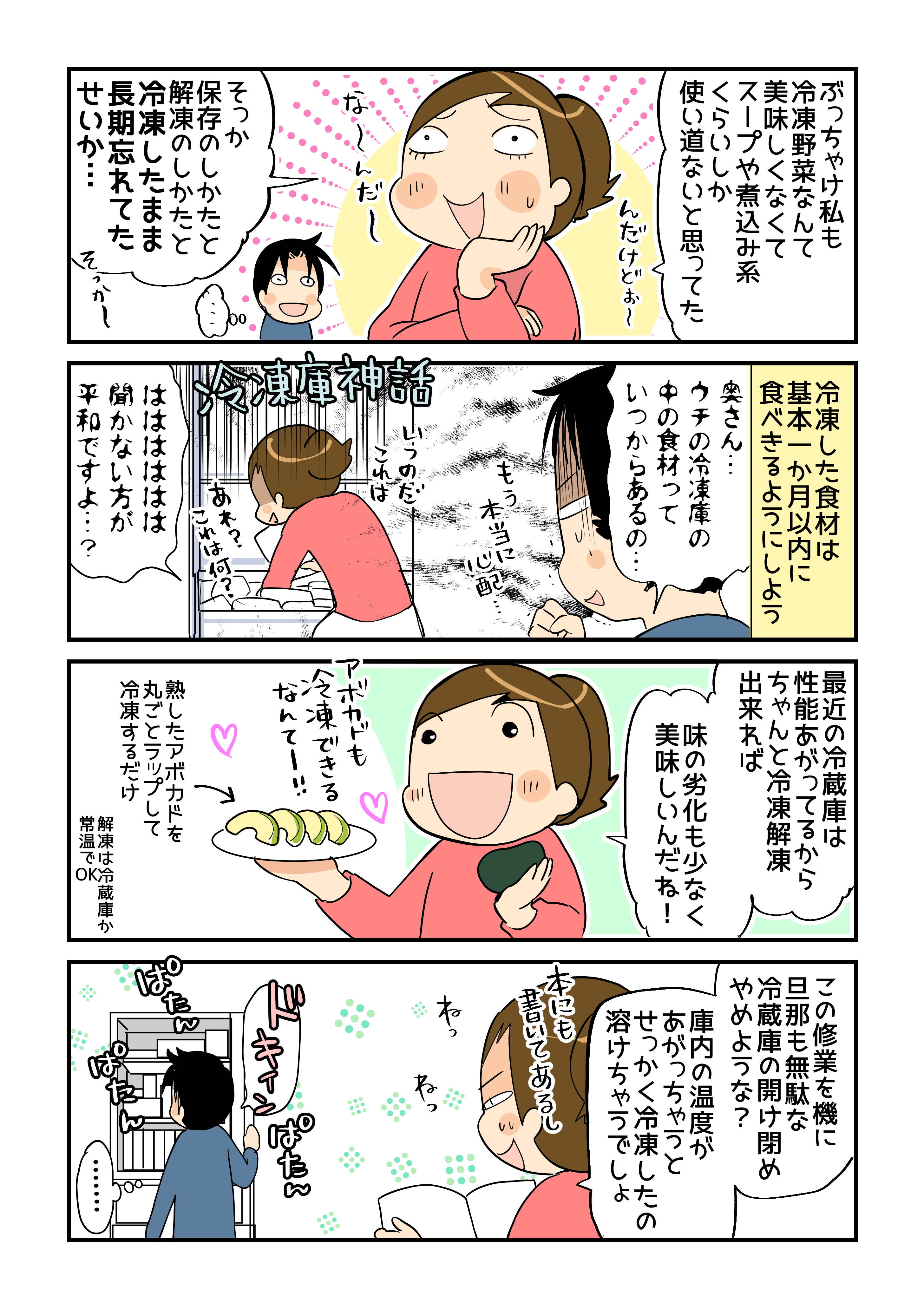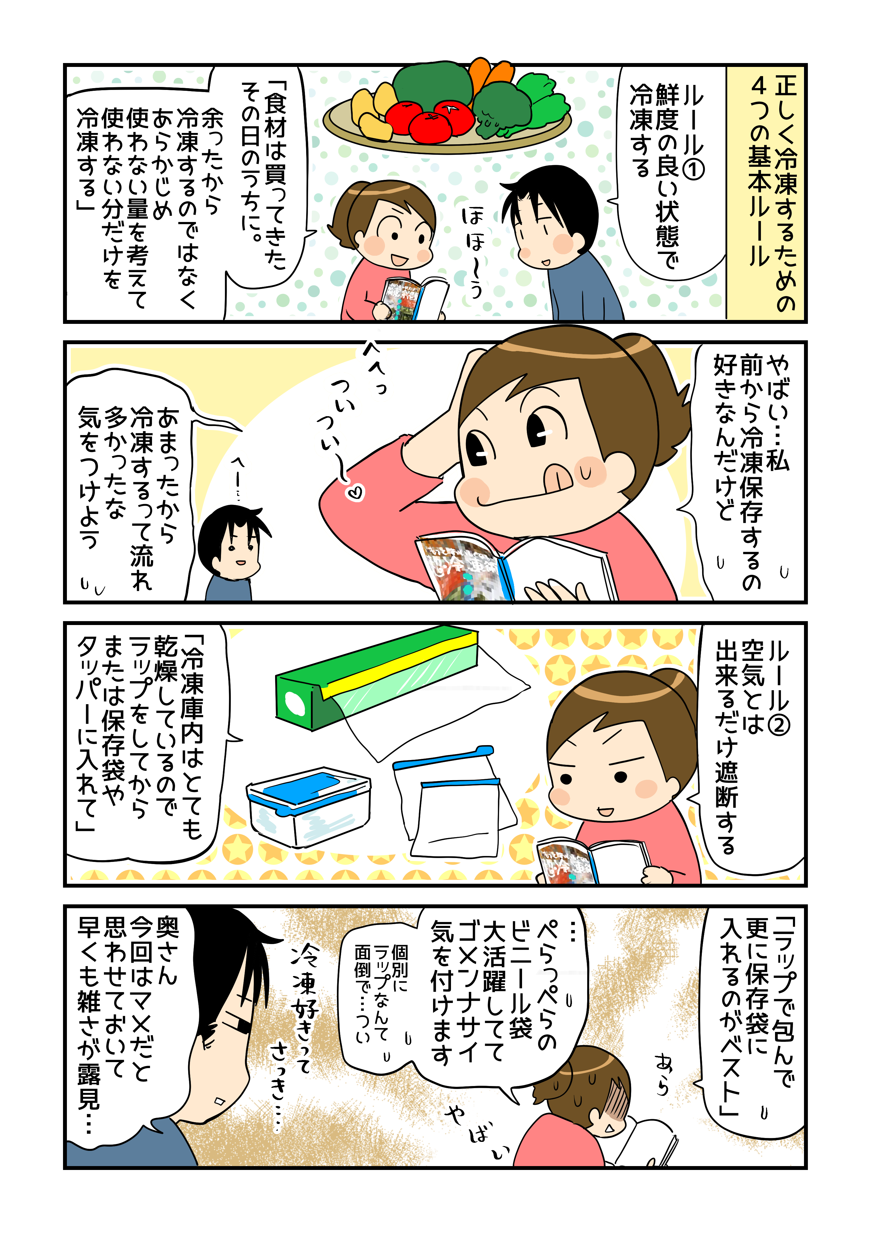インデックス付きの本文は説明も解りやすく、豊富な写真は大きくて見やすいです。 多めだけど無理して全部使ったり、どうしようもなく余らせてしまったり、知らない間に賞味期限が切れていたり。。。。これまで上手に使いこなせなかった食材が冷凍保存できることにびっくり。 今まで知らなかったことや、こんなモノもこんな風に冷凍できるのか~!と目うろこな情報も多いはず(^^) 冷凍する時に疑問に思っていたことをQ&Aで教えてくれるコーナーや、冷凍した食材を応用して作れるレシピも載ってるので便利ですよ!
