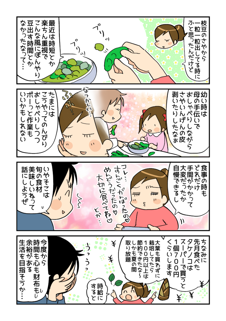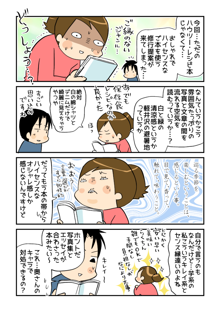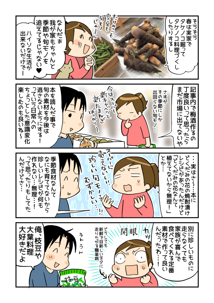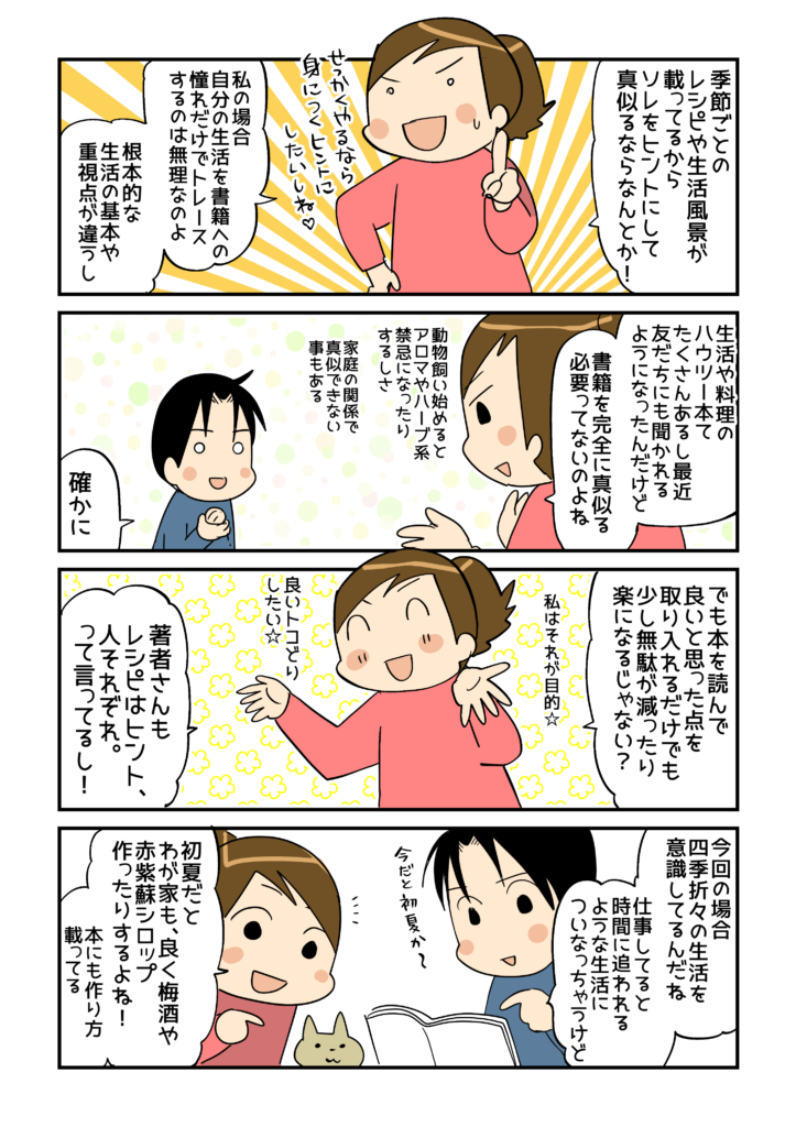漫画の中でもお伝えしましたが、著者の中川さんは季節を丁寧に追っていて、ふとした時間を楽しんだり、四季折々の料理を作っておられるので、時間に追われながら毎日をなんとかドタバタとこなしている私には、本を読んだ直後は正直、すごくハードルが高く感じられました(笑) 。