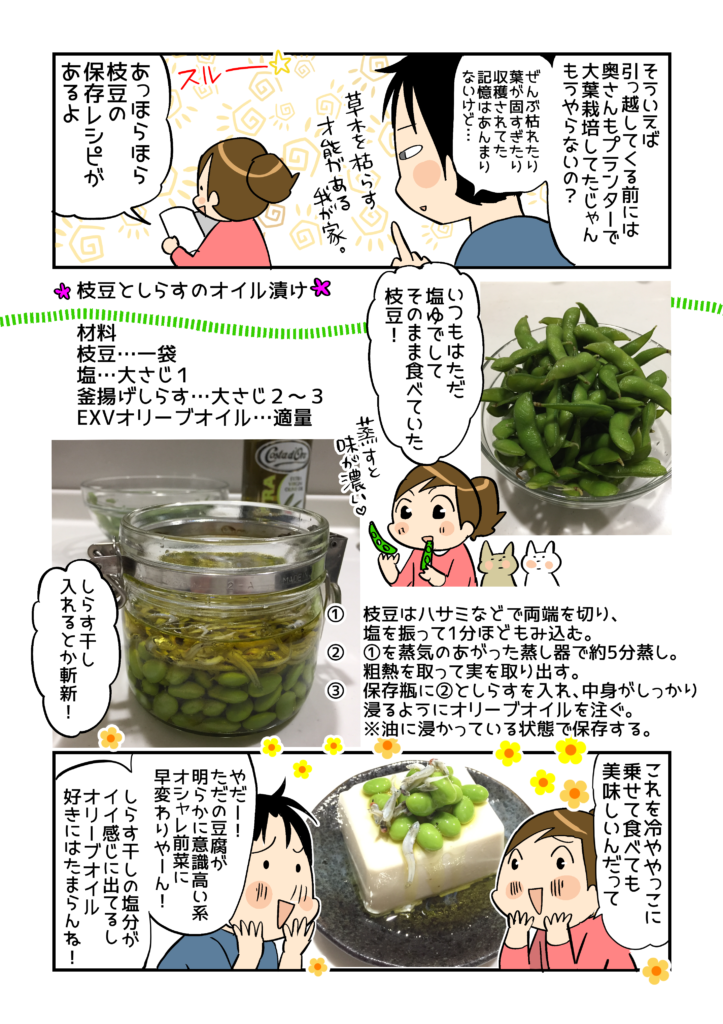 そうそう、実家の母に早速「枝豆しらすレシピ」を教えたところ、実践してみてくれたのですが、オリーブオイルに慣れない人にはちょっと癖が強かったみたいです。オリーブオイルの香りが苦手な人は、若干香りが弱めな国産をおすすめしま~す!