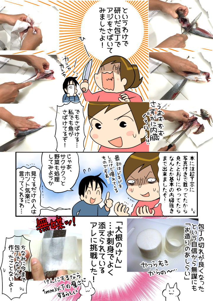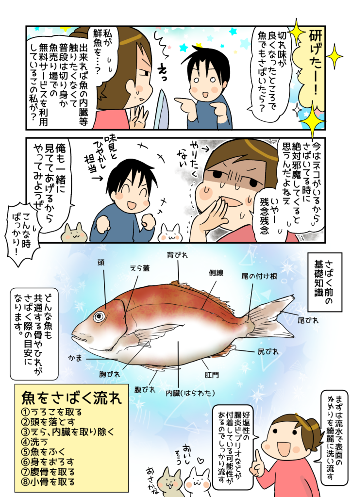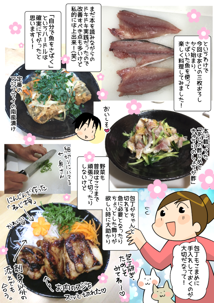 普段から私は、魚は既に切り身処理されたものしか買っていません。 そんな私でもこの本の手順通りにやったらなんとかさばくことが出来ました! キッチンに存在していたことを思い出した砥石でまめに包丁を研ぐようになったことで、包丁の切れ味も前より良くなったし、基本のさばき方を知ったことで、処理されてないけどすごく安くなっている特売のお魚を買う時のハードルが低くなりそうです!