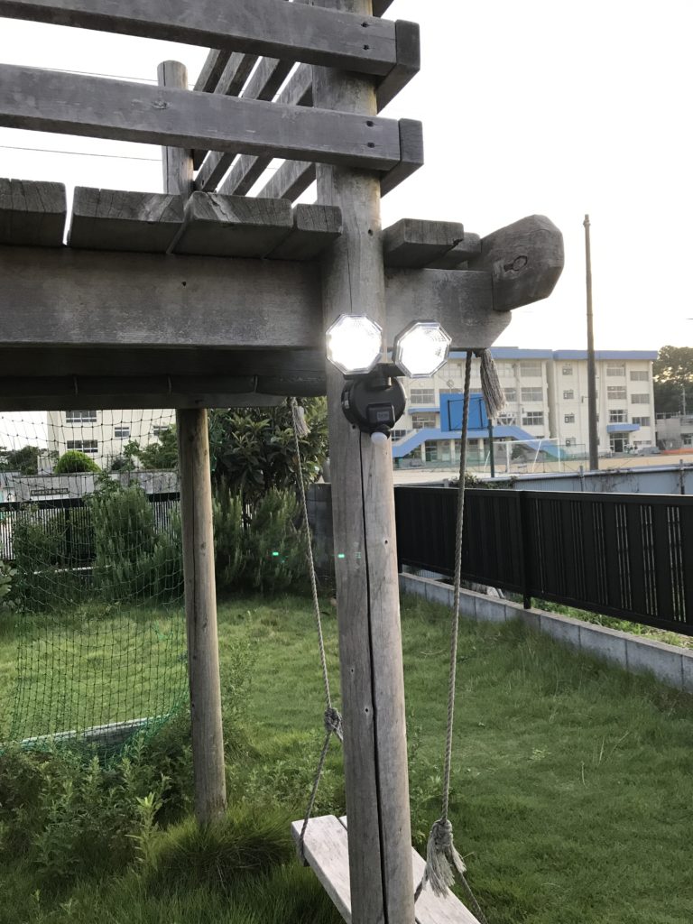 そしてさらに、お庭にも!我が家の子ども達は、夜間、庭でサッカーの練習をするのですが、庭には灯りがなかったので、庭に面した1階と2階の部屋の電気を全てつけて庭を照らしていました!でもこれって電気代がちょっと気になっていたんです庭にセンサーライトを取り付けたら、この明るさだけで十分!でもすぐに乾電池がなくなるかも!?と心配でした。いえいえ大丈夫!これにはオートモードがあるので、必要なときだけ点灯できるので電池の消耗が少なくて済むので安心です♡