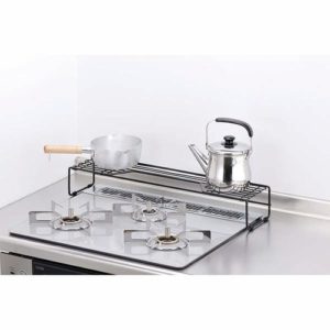 三つ口コンロでも使用できるように、ラックの中央は凹みが作られる工夫が♪付属のゴムを足に付ければ、ぐらつきも傷も防止できるし、滑り止め効果も期待できます。何を置こうかな~と考えるのは楽しいですよね(^_-)-☆