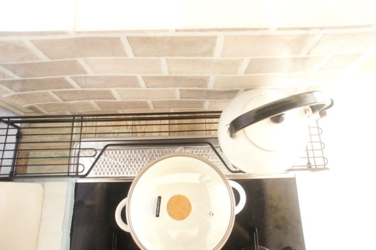 わが家のキッチンサイズに合わせて選んだのは、ビルトインコンロ用 75センチというもの。コンロ奥に置いてみると、いい感じにピッタリ!特に圧迫感もありません。