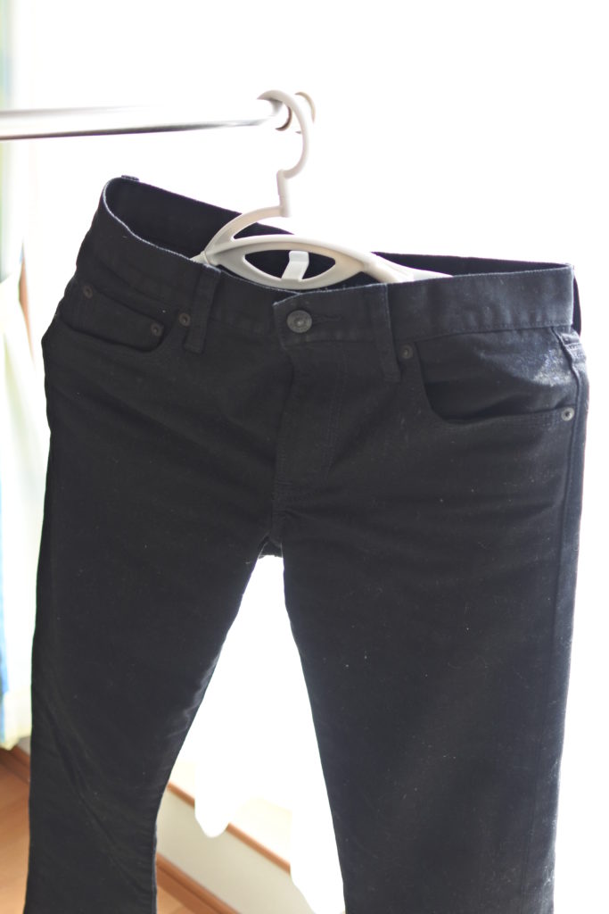 もしやこのハンガー、ジーンズやズボンを干すときにもいいかも‼と思ってチャレンジ!すると思った通り、普段よりもかなり早く乾いてくれましたよ。どんなサイズでも対応するわけではないかもしれませんが、ハンガーの角度が変えられるので、ズボンのずり落ちも防げました。