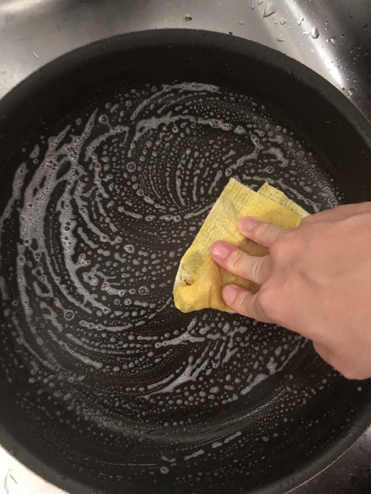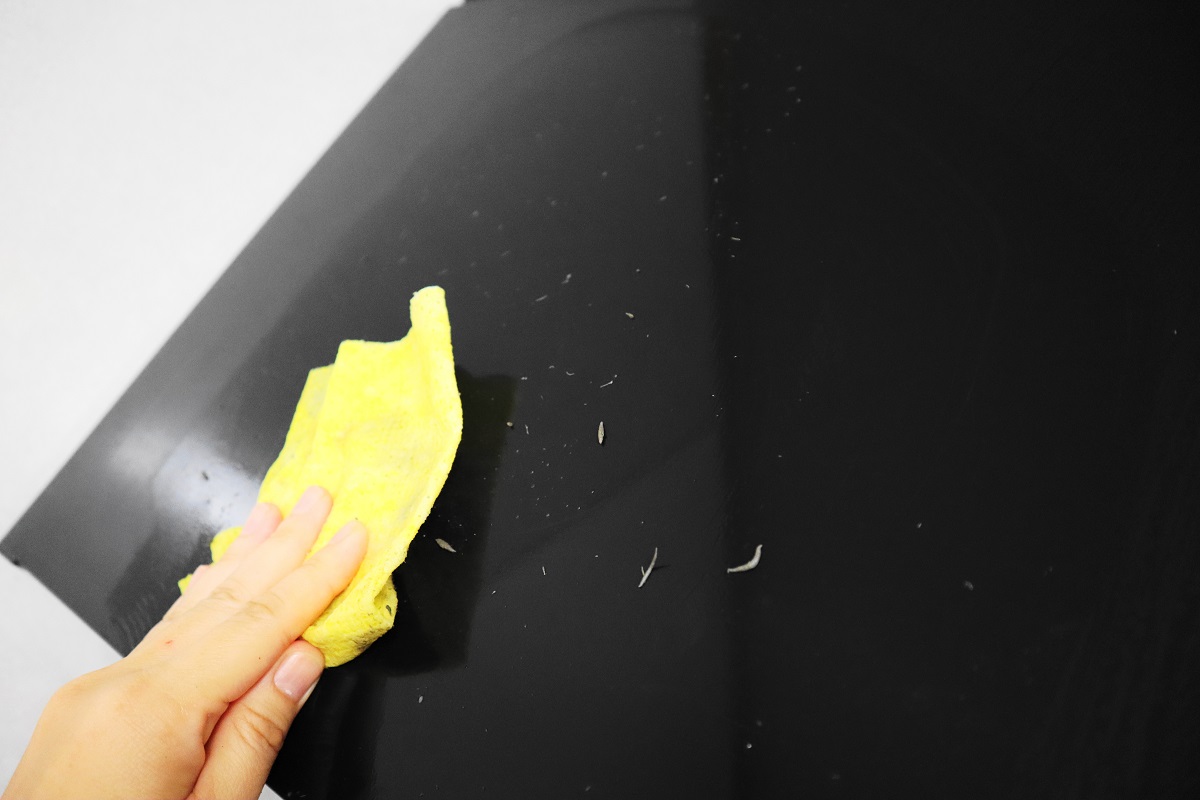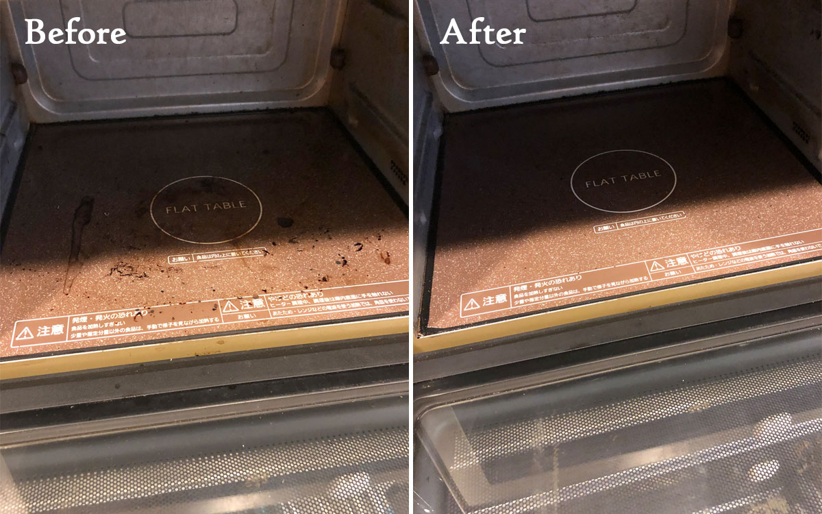 まずはセスキ水を庫内にしっかりスプレーして重曹を少し振りかけます。10秒ほど軽くチンして蒸気を行き渡らせて、ペースト状になった重曹をこすりつけて汚れを落とします。そのとき、今まではキッチンペーパーを使ってふき取っていましたが、キッチンペーパーはすぐに水分を吸ってしまうので、何枚も使う割にはきれいにならなったのです。