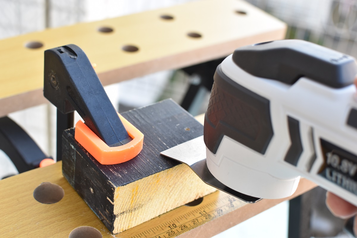 今までにもDCMの充電式工具を使わせていただきましたが、これは圧倒的な存在感です。少し重さがありますが、マルチツールはその名の通り木材の切断だけではなくマルチな使い方ができる道具。標準付属品も多いので幅広いDIYに便利だと思います。