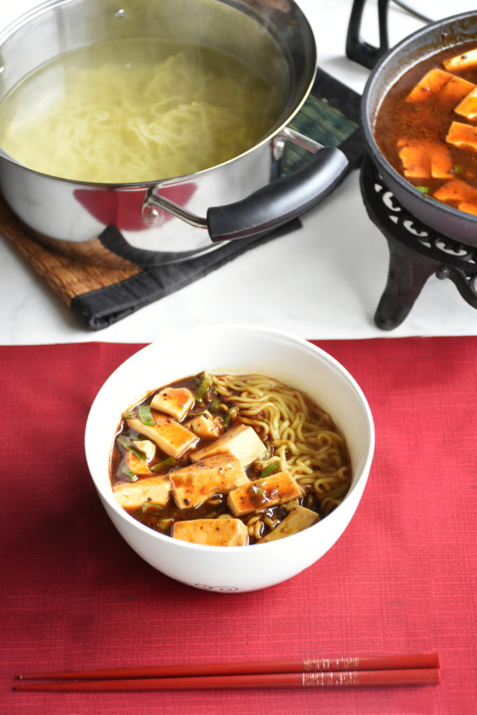 インスタントラーメン(しょうゆ味)・・・2袋水・・・規定量麻婆豆腐の素(市販品)・・・1袋(2人前)絹ごし豆腐・・・1丁ねぎ・・・1/4本
