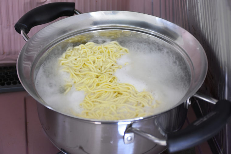 2)鍋に水を入れ、肉とキャベツ、玉ねぎ、インスタントラーメンを入れ、ふたをして3分ゆでる。