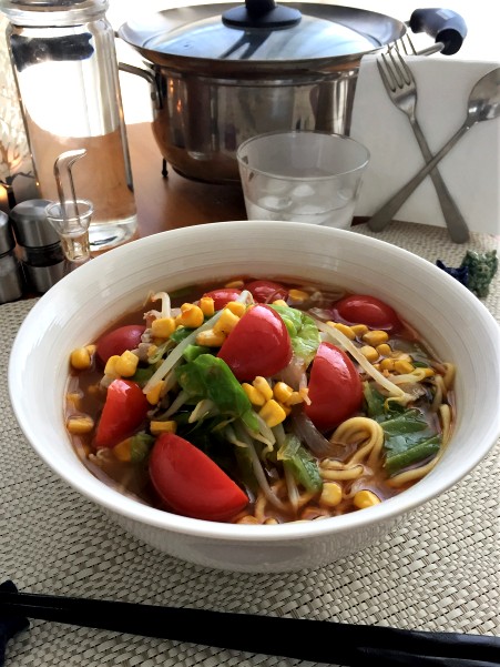 お野菜たっぷりおうちラーメン。キャベツやもやしの他、トマトがたっぷり入ります。軽く煮込んでとろんとしたトマトがおいしさのポイントです。