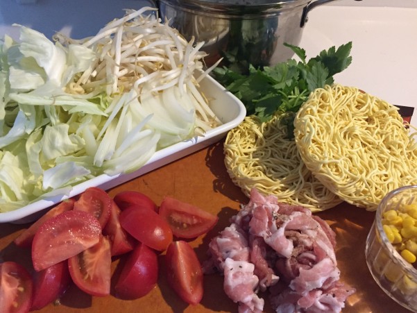 インスタントラーメン・・・2袋豚バラしゃぶしゃぶ用・・・100gキャベツ・・・200g(葉4枚程度)もやし・・・200g(1袋弱)玉ねぎ・・・80g(1/3個)トマト・・・200g(大1個)コーン缶・・・30gラー油・・・少々