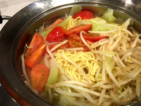 3)ふたをはずし、もやしとトマトを加え沸騰したら火を止め、スープの素を加えコーンをのせる。トマトともやしはあとから加えることで歯ごたえを残す。お好みでラー油をかける。