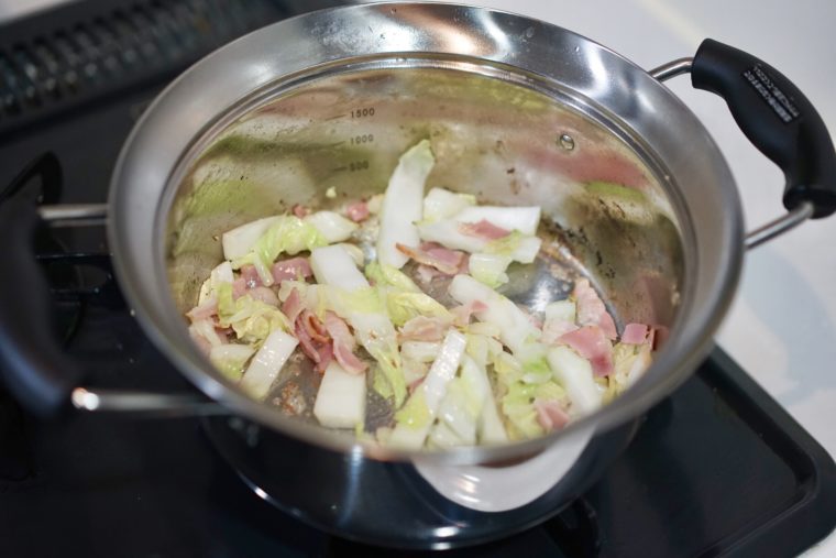 1)白菜は繊維に逆らうように、1cm位の太さに切っておく。ベーコンも同じ太さに合わせて切っておく。2)お鍋にバターを入れて火を付け、ベーコンと洗って水気を切った白菜を加え、中火で炒める。