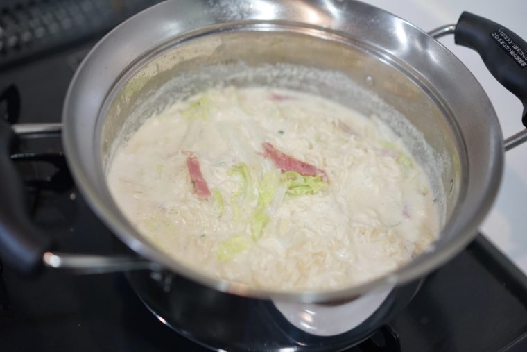 3)あらかじめ無調整豆乳と水は混ぜておき、白菜に透明感が出てきたら、混ぜておいたものを注いで(沸騰はさせないように)温める。ねりごまを加えて溶かす。4)温まったら、インスタントラーメンの麺のみを加えて、袋表示どおりの時間で麺を煮込んでいく。