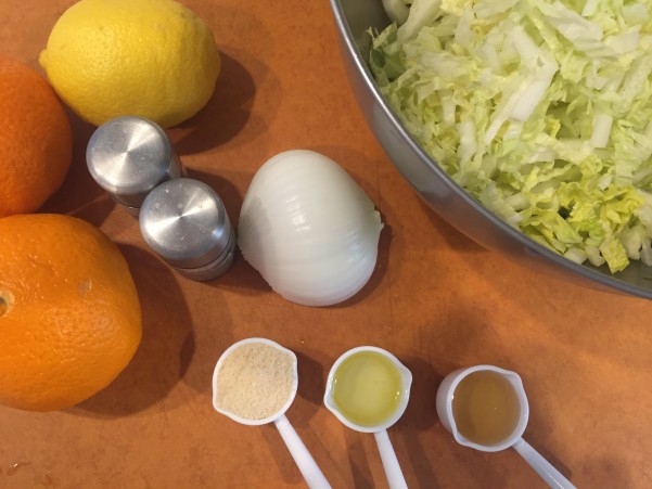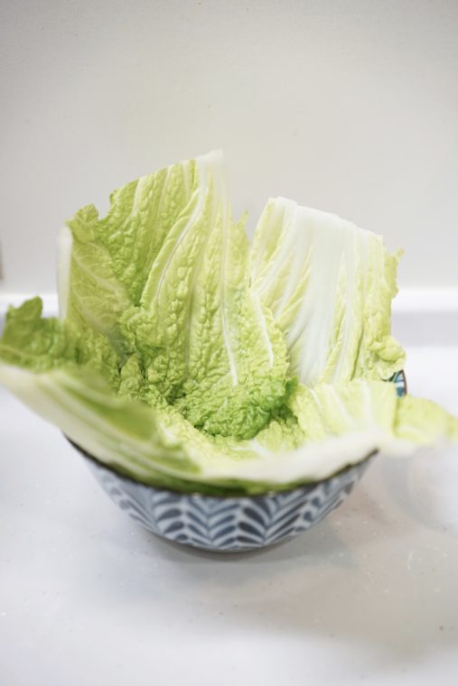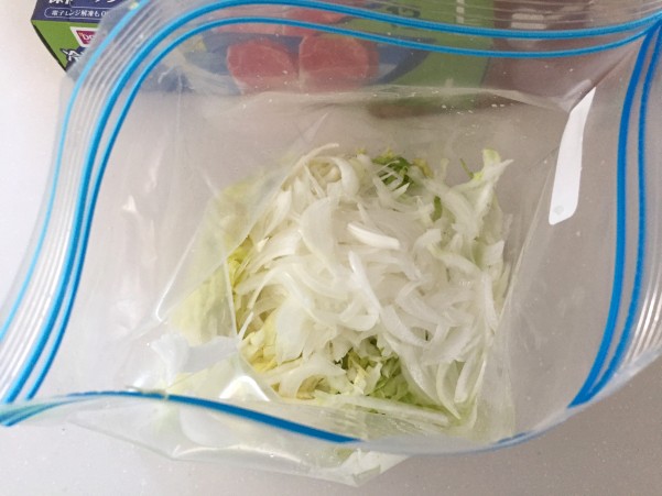 3)タネ用の白菜の根元部分はみじん切りにし、塩をかけてしばらく置いて、水気が出てきたら水分を絞る。