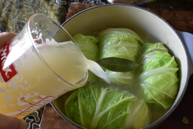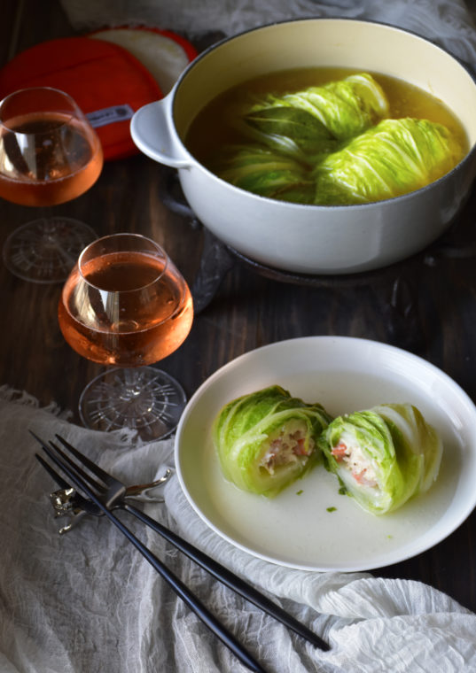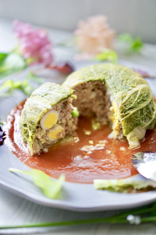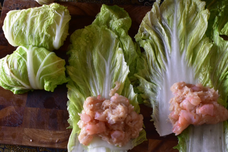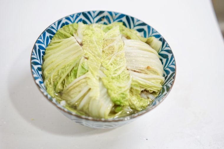 5)常温になった2)のどんぶり茶碗の白菜の上から、4)の肉ダネを1/3量ずつ詰め、ゆでうずら卵と冷凍枝豆を間に乗せて、さらに肉ダネをのせる。これを繰り返して、白菜の上の緑の葉の部分を内側に折り返す。肉ダネが見えている部分には、別途白菜の葉っぱをのせて全体を白菜で包む。(余白を埋めた白菜は分量外。小さい葉が2枚くらい)