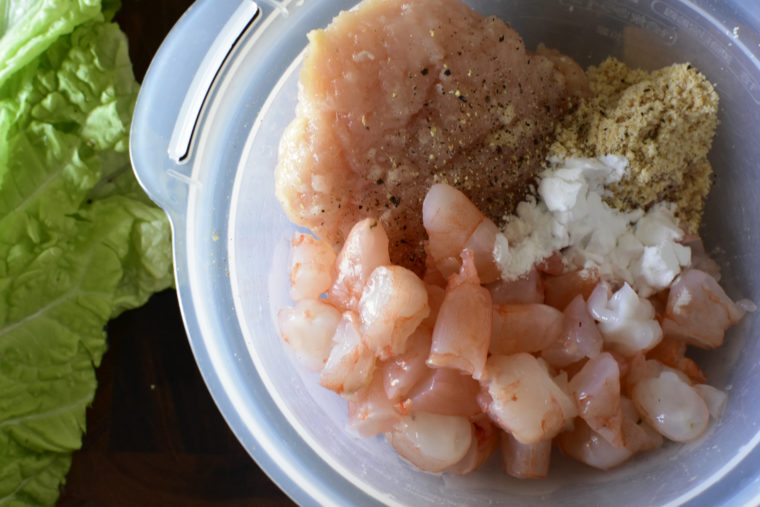 4)ボウルに合挽き肉、マヨネーズ、おろしにんにく、3)の白菜を入れて、粘りが出るまでしっかり練る。