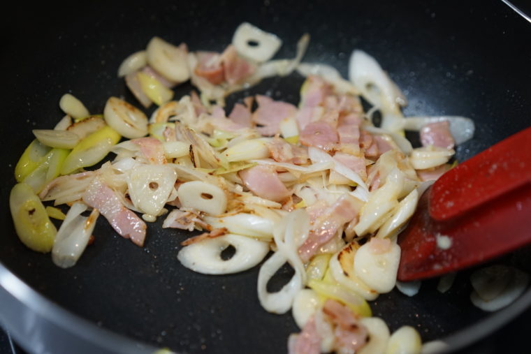 1)白葱は斜めに薄くスライスし、にんにくは皮をむきヘタを取って、薄くスライスしておく。ベーコンは1㎝位の幅に切っておく。2)フライパンにバターを入れて、1)の具材を中火で炒める。