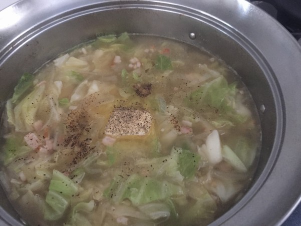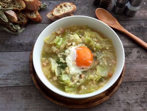 キャベツ・・・1/4個(250g)玉ねぎ・・・1個(200g)ベーコン・・・50gオリーブオイル・・・大さじ1杯水・・・800㏄野菜だし(顆粒)・・・16g塩・・・少々バター・・・15g卵・・・2個パルミジャーノ・・・少々