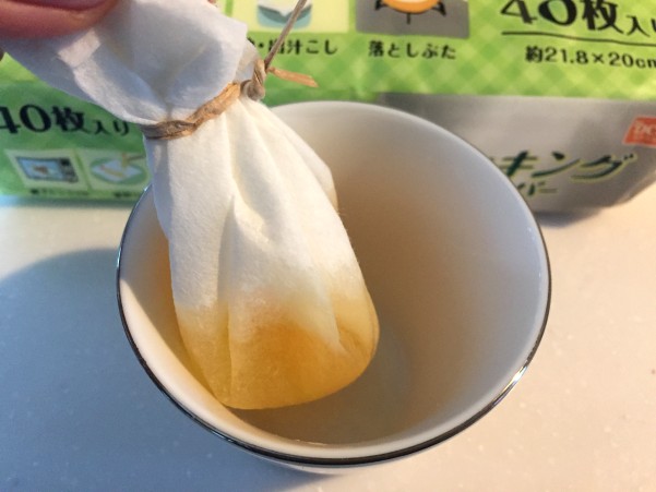 4)クッキングペーパーをコップに入れ、そこに卵を割り入れて、上の部分を輪ゴムなどでしっかり閉じる。