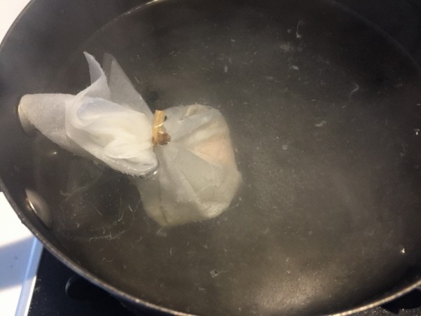 5)沸騰したお湯にそっと入れ、弱火にして2分、時々上下をそっと返しながら茹でる。器にとり、クッキングペーパーをそっとはずし、スープを盛りつけた器にのせる。