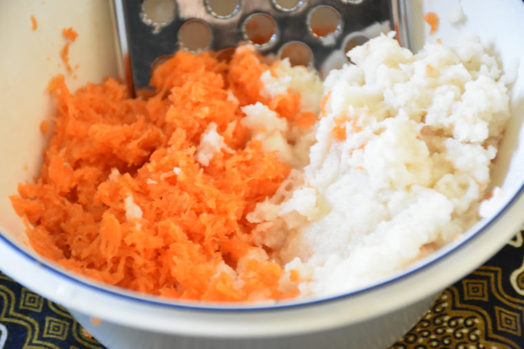 れんこん・・・100gにんじん・・・50g(野菜のグラム数のおおよその目安は、れんこん一房=200~300g にんじん1本=120~200g位です)☆豆乳・・・150ml☆水・・・100ml☆チキンコンソメ(顆粒)・・・小さじ2・トッピングの材料粗びき黒こしょう、乾燥パセリ等お好みで。