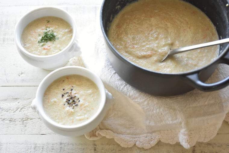 冬のほっこりあったか、風邪予防のスープ。れんこんのすりおろしでとろみがつきます。にんじんをプラスして、栄養アップ&ほんのりオレンジ色の綺麗なスープに仕上げます。チキンコンソメは、中華スープ、白だし、白味噌等に変えても美味しい。豆乳が苦手な方は、牛乳で代用して下さい。