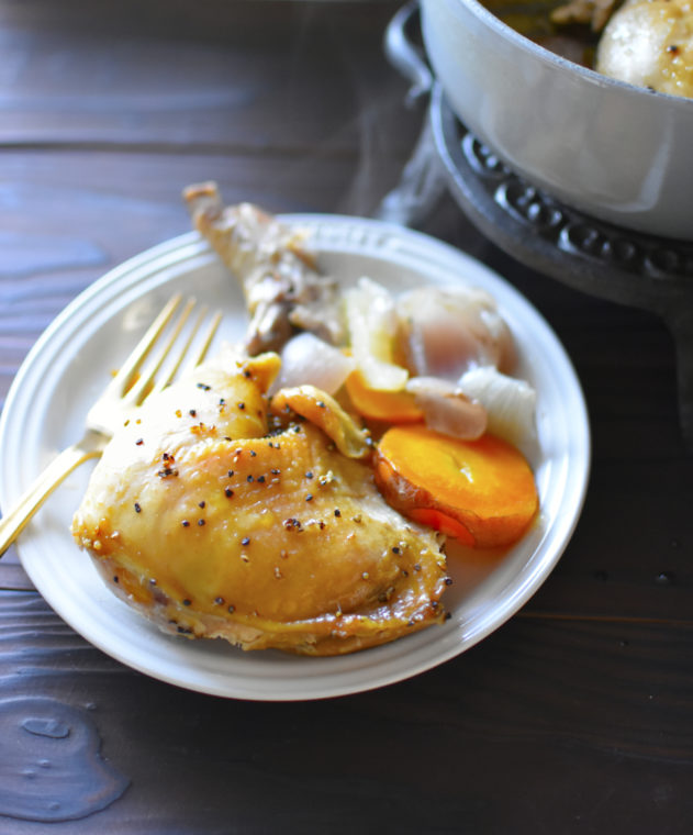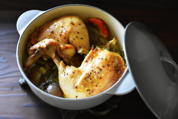 低温調理でほうっておくだけ!しっとりジューシーなやわらかチキンです。骨付き鶏肉をお野菜と一緒にオーブンに入れるので、一緒に入れた野菜を付け合わせやスープにアレンジできて一石二鳥。140度の低温でじっくりと加熱することで、お肉がほろりとほどけるやわらかさになります。