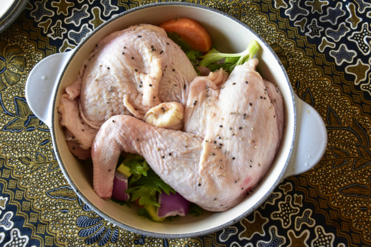 骨付き鶏もも肉・・・2本(1本300gのものを使用。2本で600g)玉ねぎ(中)・・・1/2個(100g)にんじん(中)・・・1/2本(100g)セロリ・・・1本(100g)☆塩・・・小さじ2☆粗びき黒こしょう・・・小さじ1水・・・200ml