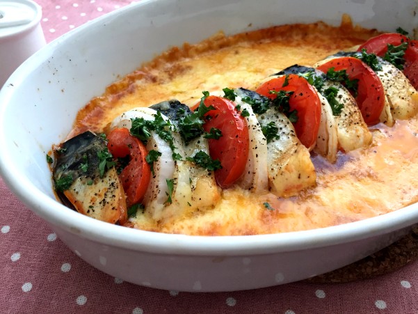 サバを使った時短簡単!オーブン料理です。市販のトマトソースを耐熱皿に敷き、食べやすい大きさに切ったサバ、トマト、玉ねぎを交互に並べて、両サイドにとろけるチーズをたっぷり入れてオーブンで焼きます。サバは3枚おろしを使います。焼く前にサバに日本酒をふって臭みを抜くのがポイント。チーズをたっぷり絡めてお召し上がりください。