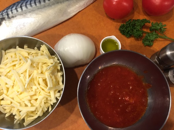 サバ・・・3枚おろしの半身(160g)日本酒・・・大さじ1玉ねぎ・・・1/2個(60g)トマト・・・1個(70g)トマトソース(市販品でも)・・・80gとろけるチーズ・・・100gオリーブオイル・・・小さじ2パセリ・・・少々