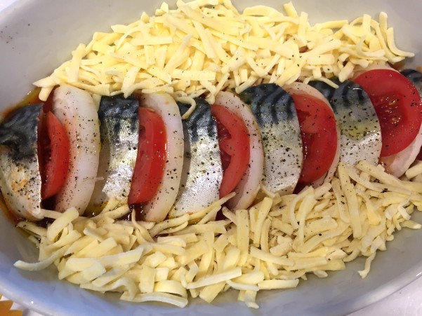 1)サバは食べやすい大きさに切る。日本酒をふり、しっかり塩・こしょうする。玉ねぎとトマトは5㎜ぐらいの厚さに切る。2)耐熱皿の真ん中にトマトソース敷き、その上にサバ、トマト、玉ねぎを交互に並べて、オリーブオイルをかけ、まわりにとろけるチーズを添える。