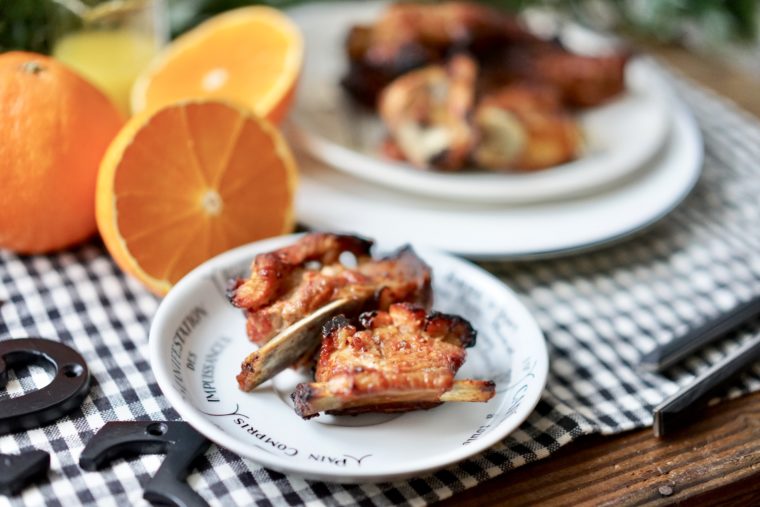 スペアリブ・・・6本(約500g)オレンジジュース(果汁100%)・・・50ccケチャップ・・・大さじ4杯濃口しょうゆ・・・大さじ1/2杯粒マスタード・・・大さじ1杯おろしにんにく・・・小さじ1杯