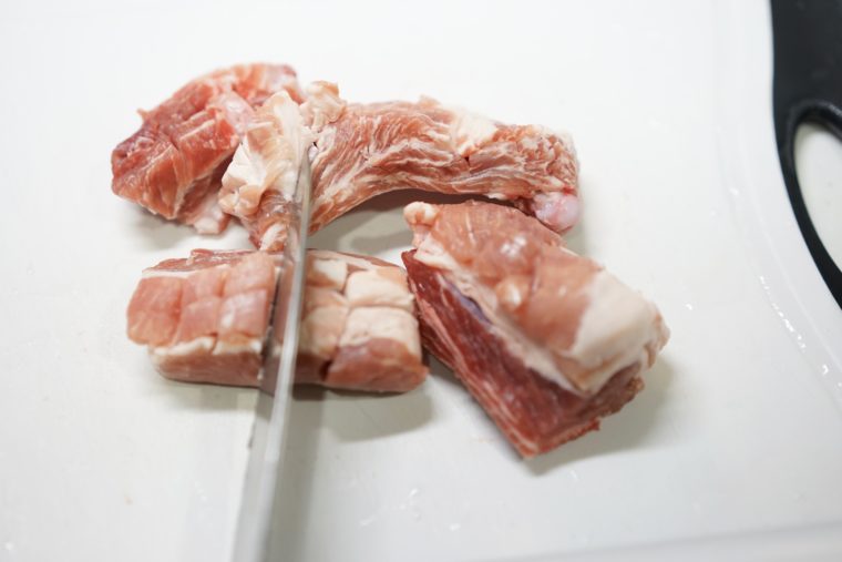 1)スペアリブの肉の部分を、縦横、骨に当たる所まで包丁を入れておく。数ヶ所入れておくことで食べやすく、味もしみ込みやすい。