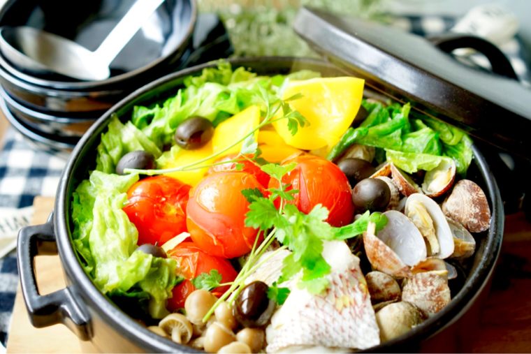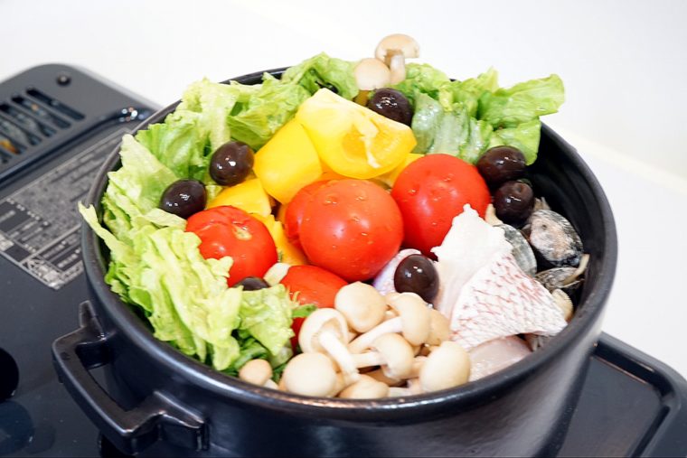 4)鯛・あさりを入れ、2)で下処理しておいたお野菜を隙間なく詰める。上にオリーブの実とローリエをのせて蓋をして、食材に火が通るまで加熱すれば完成。