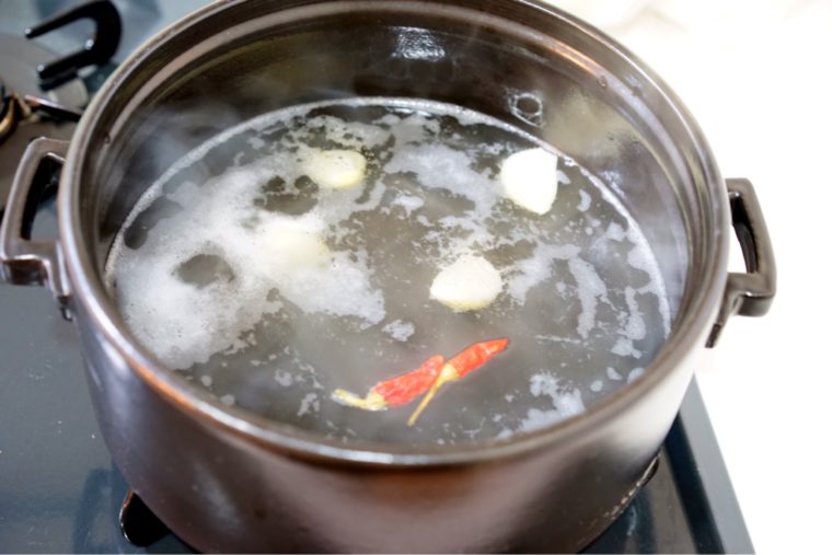 1)あさりはしっかり砂抜きをしておく。2)パプリカは、ヘタと中の種を取り除いて適当な大きさにカットする。ミニトマトはヘタを取る。レタスは芯を取り除き、洗ったあとにちぎっておく。しめじは石づきを取りのぞき、4房ほどに分けておく。にんにくは皮をむいて、スライスしておく。唐辛子は乾燥タイプを使用する場合は水でもどしておく。3)鍋に白ワイン、水、塩、スライスしたにんにく、もどしておいた赤唐辛子を入れ、アルコール分が飛ぶまで煮立てる。