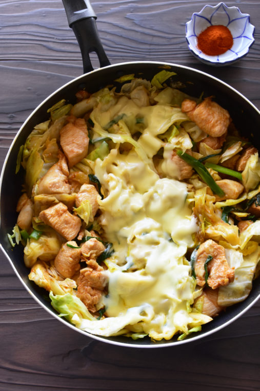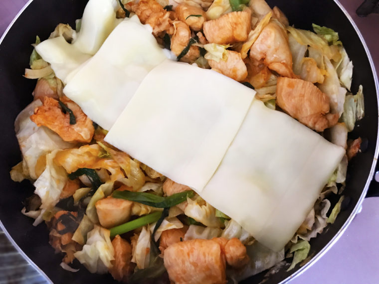3)フライパンにごま油、☆、2)の鶏もも肉の順に入れて蓋をして、中火の弱で蒸し焼きにする。4)5分たったら1度大きく混ぜ再び蓋をし、肉に火が通ったら大きく混ぜ、スライスチーズをのせる(スライスチーズはタッカルビ鍋の熱で溶けます)。キャベツを蒸し焼くことで水分が出てぐつぐつと煮えるので、混ぜるのは2度だけにするのがポイント。