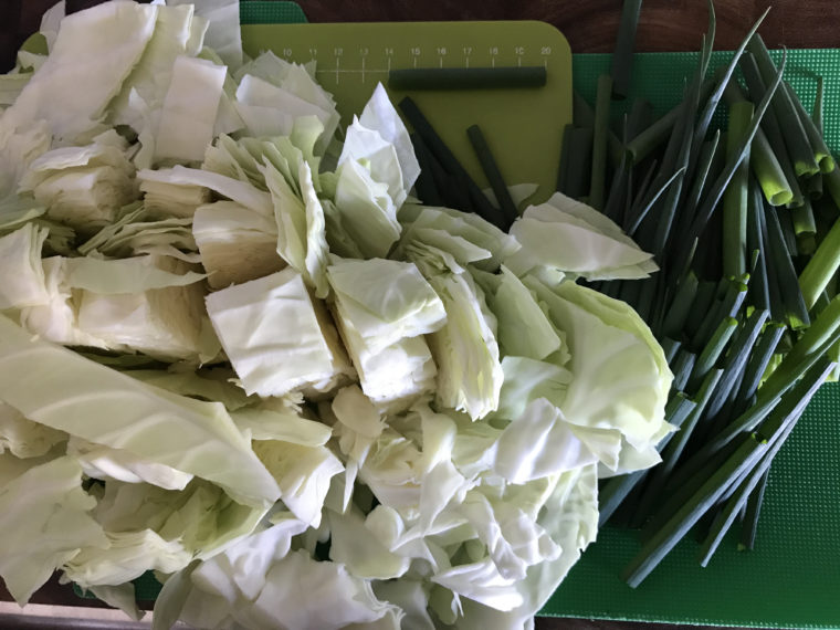1)鶏もも肉は小さめの一口大に切る。キャベツはざく切りにする。小ねぎは3センチ幅に切る。