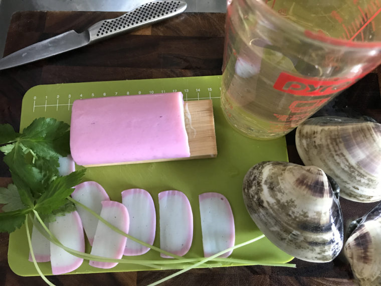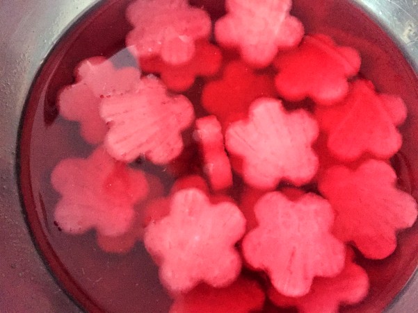 ※花型にくりぬいた大根を甘酢とビーツの皮少々に付け込んでピンク色にしたもの。