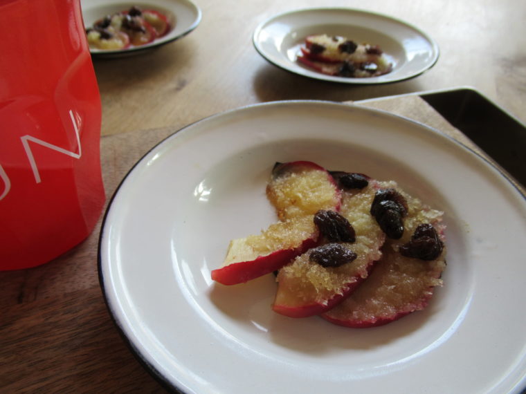 4)りんごの上に、パン粉、砂糖、小さく切ったバター、レーズンをのせ、中火にかける。蓋をして5分焼いたら完成。お皿に盛り付けてお好みでシナモンをふる。