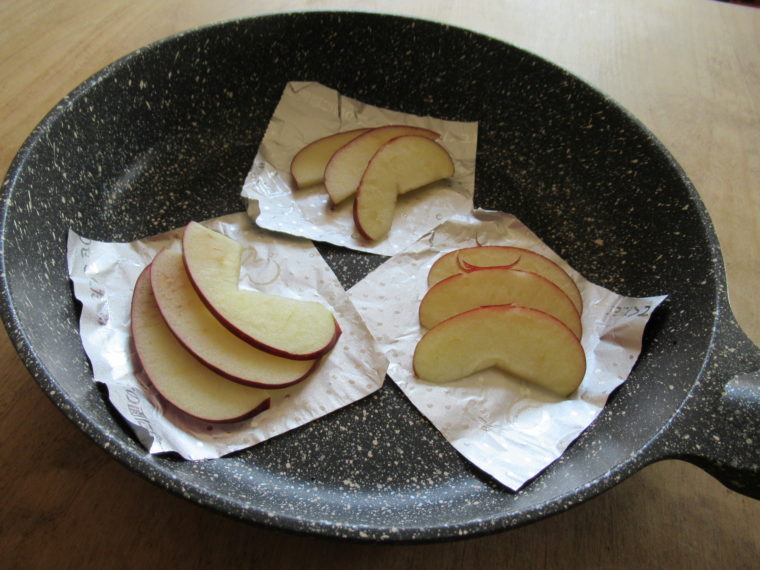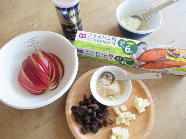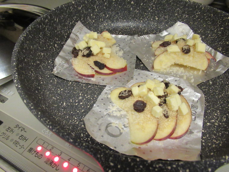 1)「DCMブランド サラッとはがれるホイル フライパン用」を10㎝×10㎝くらいの大きさにカットする。2)りんごを7~8㎜くらいの薄さにスライスし塩水につけておく。3)フライパンに重ならないようにカットしたホイルを並べ、水気をとったりんごを3~4枚ずつ並べる。