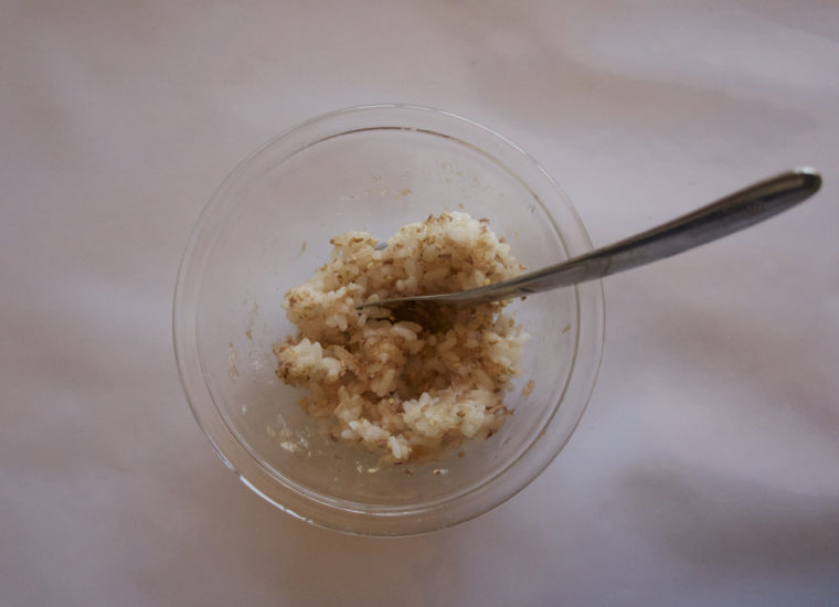 1)ごはんを電子レンジで600W20秒ほど加熱する。2)ボウルにごはんを入れ、かつお節、白ごま(青のりせんべいの場合は青のり)を入 れて混ぜる。