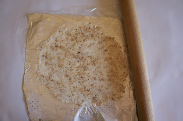 3)「DCMブランド サラッとはがれるホイル フライパン用」を20cmほどの長さに切り、中央に2)をのせ、 上からラップをして麺棒で薄く延ばす。