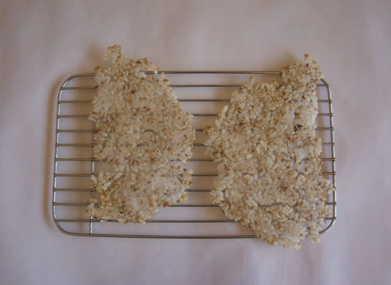 4) ラップを取り、上から塩を振ってトースターで5分ほど焼く。5)半分に手で割り、真ん中の部分が外側に来るように向きを変えて置き直し、 再度トースターで3分ほど、時々パチパチというまで焼く。 外側ばかりがどうしてもこげてしまうようであれば、上にアルミホイルをふわっとかぶせて焼く。6)網の上で冷まし、食べやすい大きさに割る。