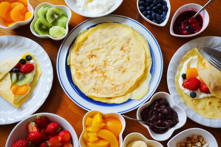 卵・・・2個砂糖・・・20g塩・・・小1/3薄力粉・・・80g牛乳・・・200㎖溶かしバター(無塩)・・・大1☆イチゴ、バナナ、キウイ、ミカン、黄桃、ブルーベリー、生クリーム、あんこ、ナッツなど