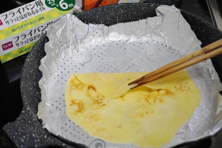 1)卵に砂糖を加え、よく混ぜ合わせる。2)1)にふるいにかけた薄力粉、塩を加えてよく混ぜる。3)2)に牛乳を少しずつ加えて混ぜ、1時間以上冷蔵庫でねかせる。4)焼く直前に3)に溶かしバターを加えてよく混ぜる。5)フライパンに「DCMブランド サラッと剥がれるホイル フライパン用」を敷いて中火にかけ、温まったらお玉8分目くらいの生地を流し入れる。ホイルが生地をはじくことがあるのでお玉の底を使って広げていく。焼き色がついてきたら裏返し、少し焼いたら生地の完成。