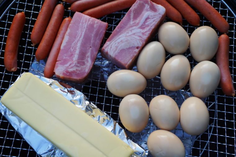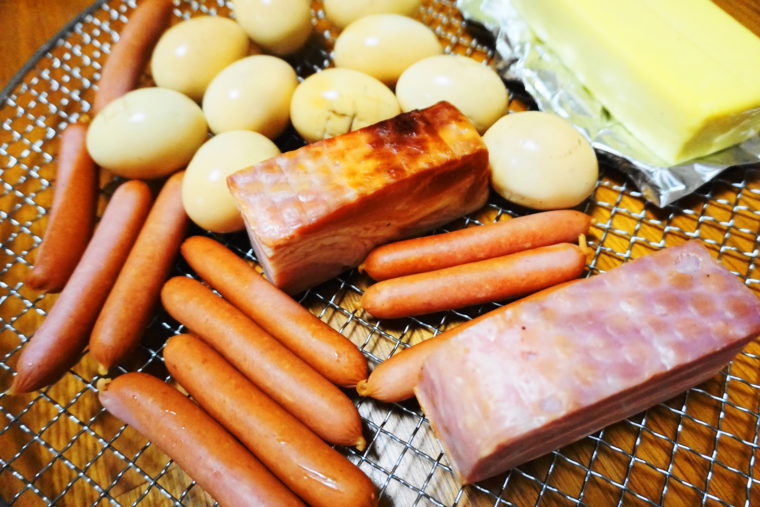 プロセスチーズ・・・170g~180gベーコン・・・170g~180gウインナー・・・5本卵・・・5個めんつゆ・・・100㏄スモークウッド(さくら)・・・1本