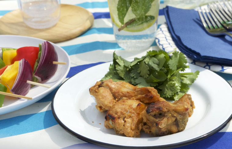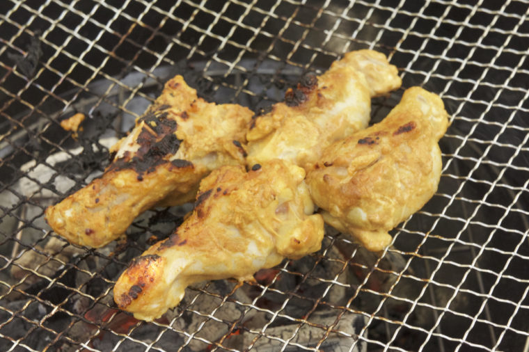 下ごしらえが楽なのに本格派に見えるタンドリーチキン。当日は焼くだけ。スパイスが効いていますが、辛みがマイルドになっているので子どもも食べやす い味付けです。ふた付きのバーベキューコンロを使えば、火が通りづらく周りが 焦げて中が生になりがちな骨付き肉も、上手に焼けます♪