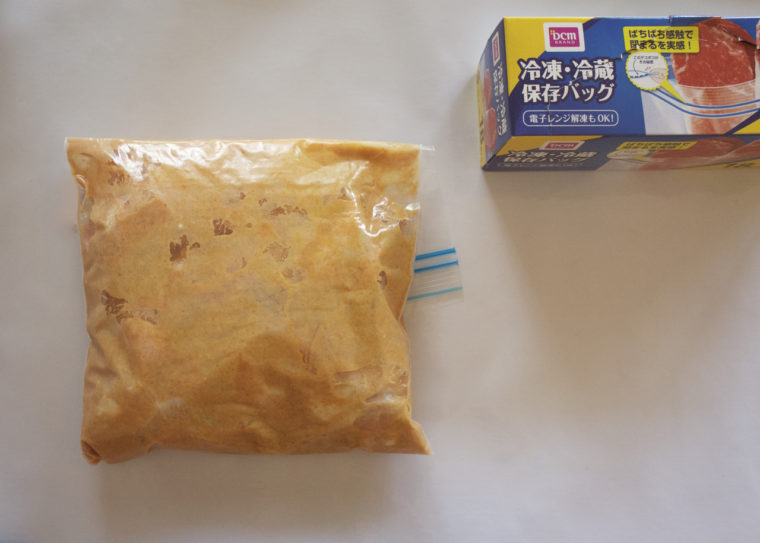 1)ジッパー付きの保存バッグに鶏手羽元以外の材料を入れ、混ざるように袋の外からもむ。